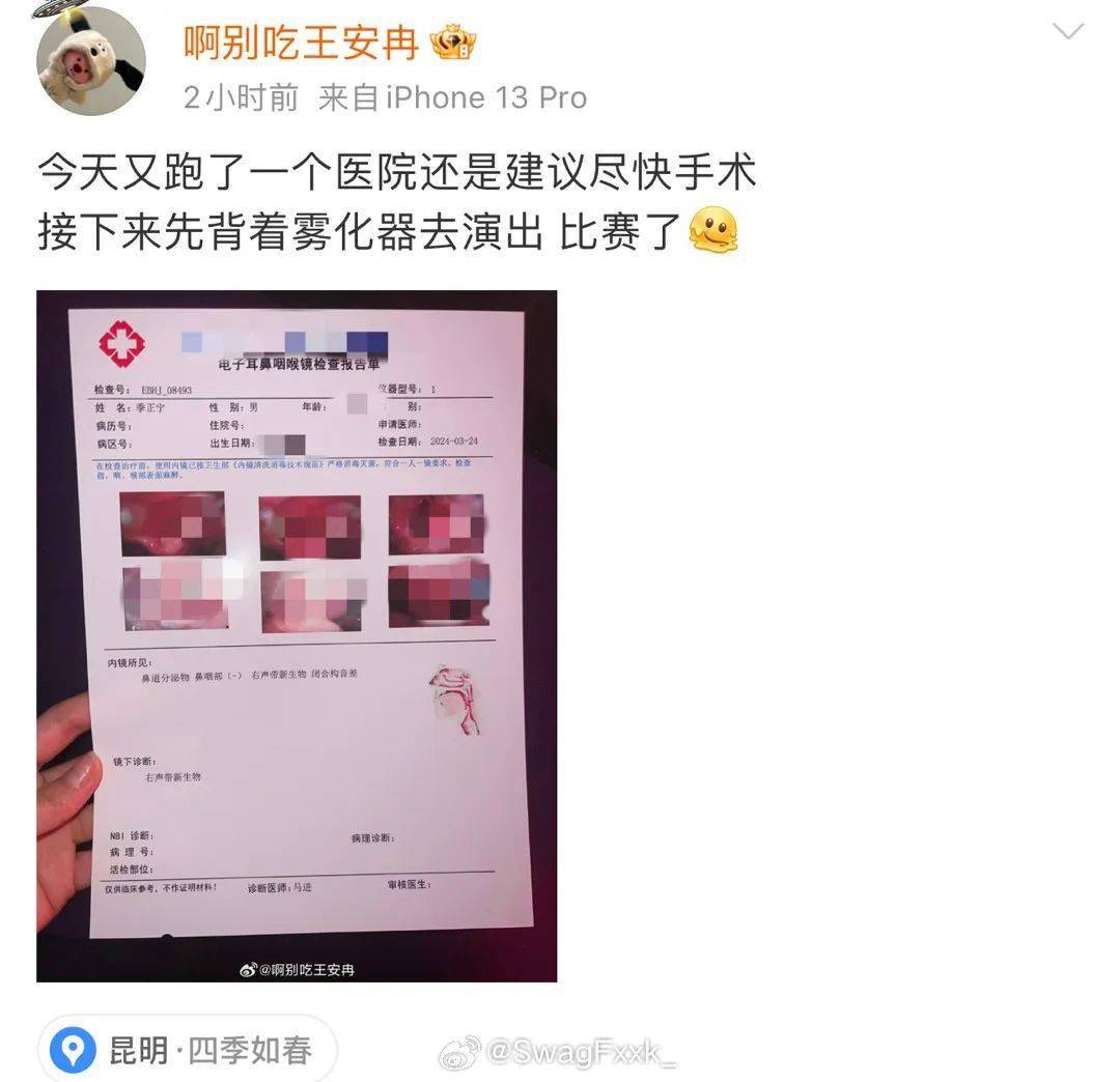 今天,新秀老婆晒出了新秀的检查报告,表示:新秀接下来要背着雾化器去演出和比赛了!