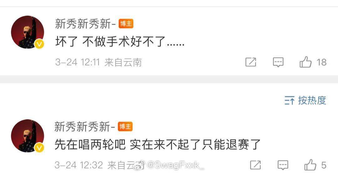 此前,《新说唱》大热门新秀透露因病需要做手术,新秀表示:先在唱两轮吧 实在来不起了只能退赛了!