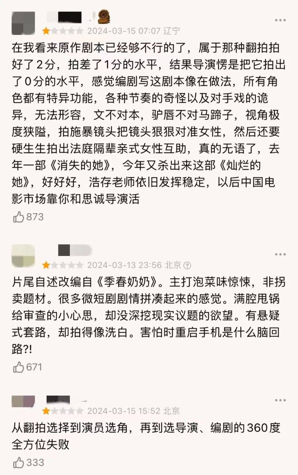 上周五,改编自韩影《季春奶奶》的《灿烂的她》正式上映。尽管豆瓣目前还未开分,但高赞评论中已经被大量一星评价淹没,目前猫眼、灯塔AI预测其最终票房1亿左右。毫无意外地,低星评价中除了对演员演技的失望之外,不乏对电影翻拍的不满。