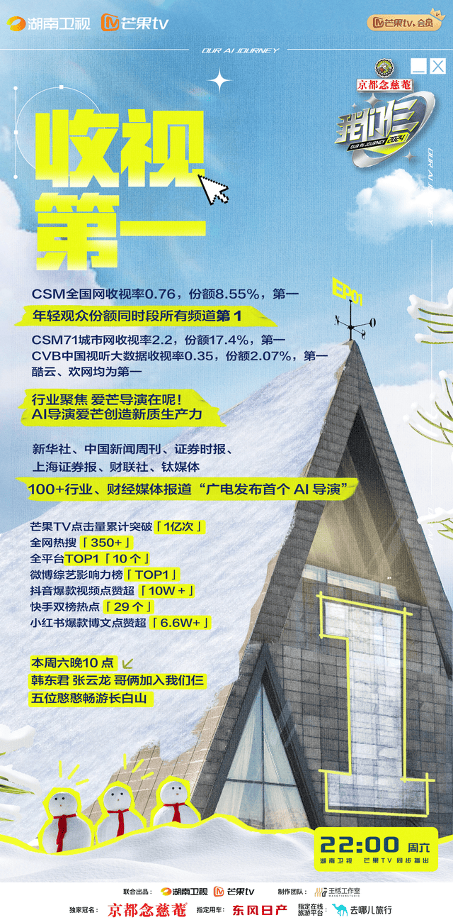 由京都念慈菴冠名、王恬工作室制作的旅行探索真人秀节目《我们仨》于3月23日在湖南卫视和芒果TV首播,每周六22:00更新。郭麒麟、毛不易、魏大勋三位好友集结长白山,和湖南广电发布的首个AI导演爱芒共同开启了《我们仨》之旅的第一程。首期节目收视夺冠,中国视听大数据CVB收视率0.348%,份额2.072%,省级卫视同时段排名第一,CSM全国网收视率0.76,份额8.55%,列同时段所有频道第1,份额超排名第2省卫的两倍,10后、00后、90后年轻观众份额均列同时段所有频道第1,欢网、酷云均排名省级卫视第1。截至目前节目已收获全网热搜超350个,新媒体榜单超10个TOP 1,开播当天微博热搜双榜热搜12个,全网传播流量超27亿。节目中三位嘉宾熟稔且有梗的互动内容,以及启用AI导演入局、开辟科技综艺新篇章的突破之举获得网友一致好评。