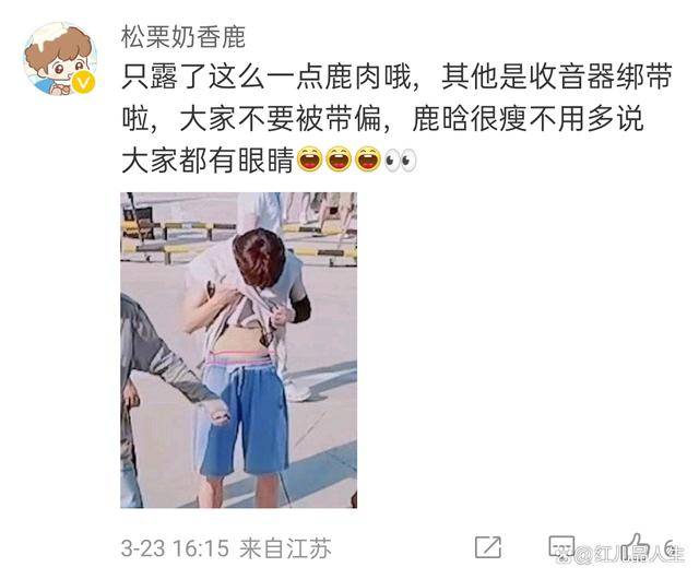 还有的说:只露了一点点鹿肉哦其他是收音器绑带啦,大家不要被带偏,鹿晗很瘦不用多说,大家都有眼睛。