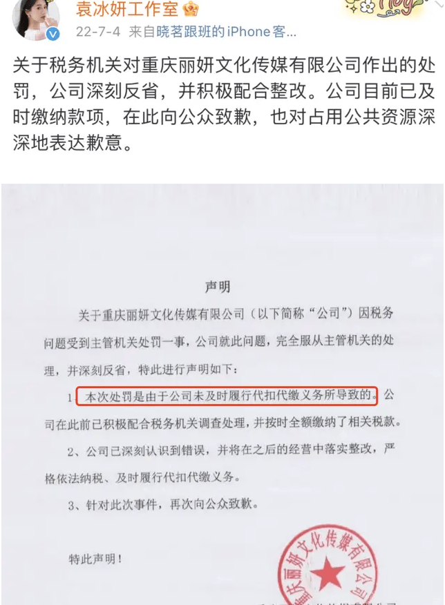 当时的声明中,还有一处很重要的点,强调本次处罚是由于公司未及时履行代扣代缴义务导致,言外之意与袁冰妍本人无关。