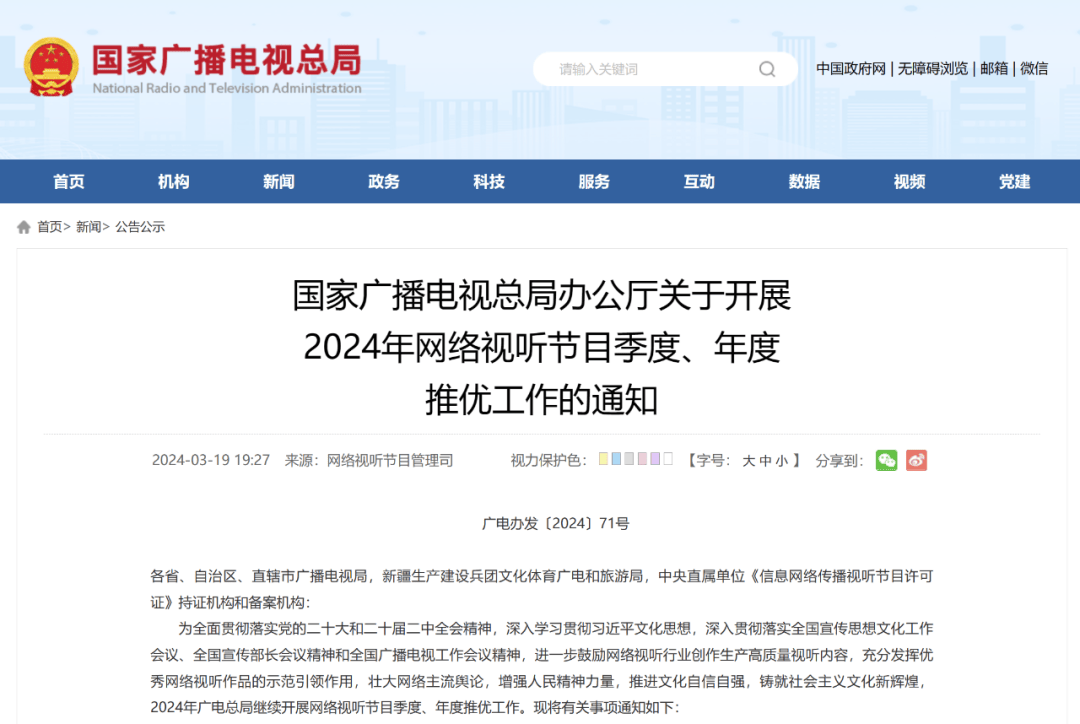 值得一提的是,3月20日,国家广播电视总局发布了《关于开展2024年网络视听节目季度、年度推优工作的通知》。