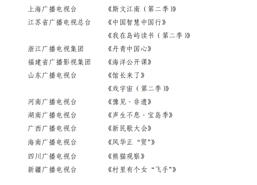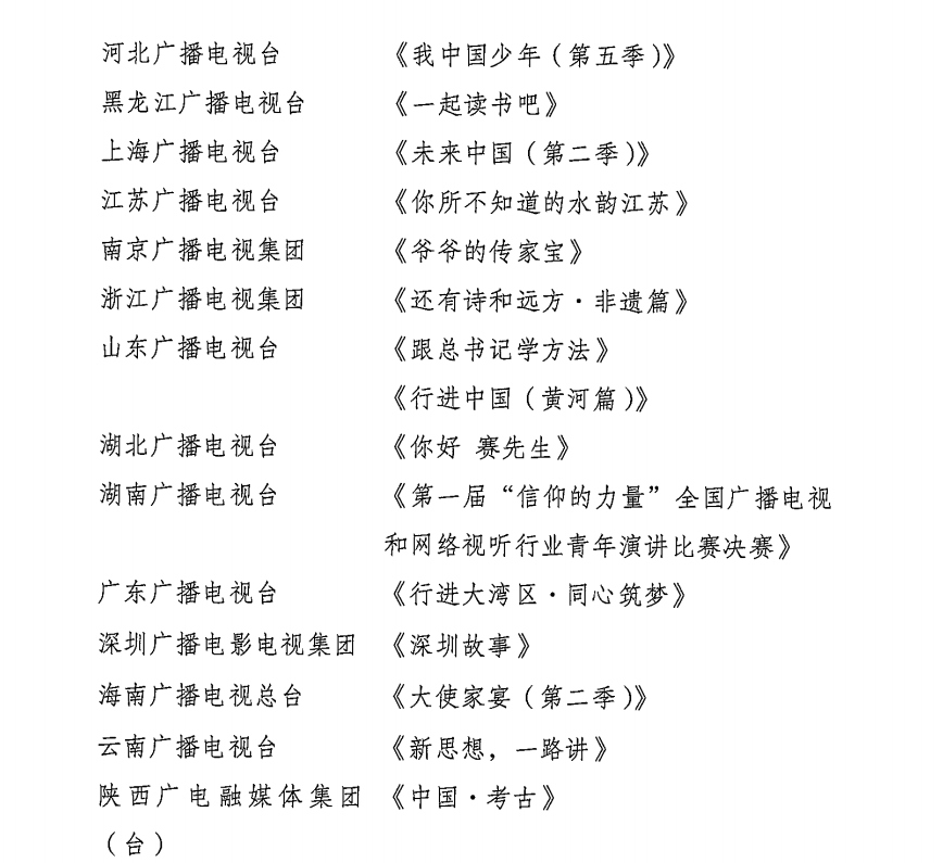 此外,还有深圳广播电影电视集团《当唐诗遇上交响乐》,内蒙古广播电视台《黄河魂》,黑龙江广播电视台《一起读书吧》,陕西广电融媒体集团(台)《中国・考古》,山西广播电视台《唐小晋博物馆奇妙记》,江西广播电视台《中国礼·陶瓷季》,贵州广播电视台《非遗正青春》等。