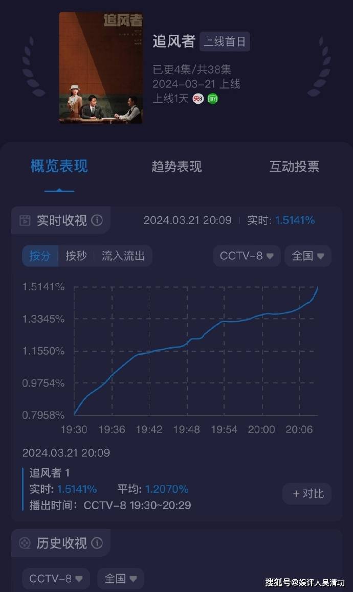 那《追风者》的收视率怎么样呢?从央八0.7%的收视率底盘一路冲到1.685%,登顶全国第一。该剧同时还在爱奇艺播出,有30万 的在线观看人数,爱奇艺站内热度破6500,轻松打破了2024年爱奇艺电视剧首日热度。