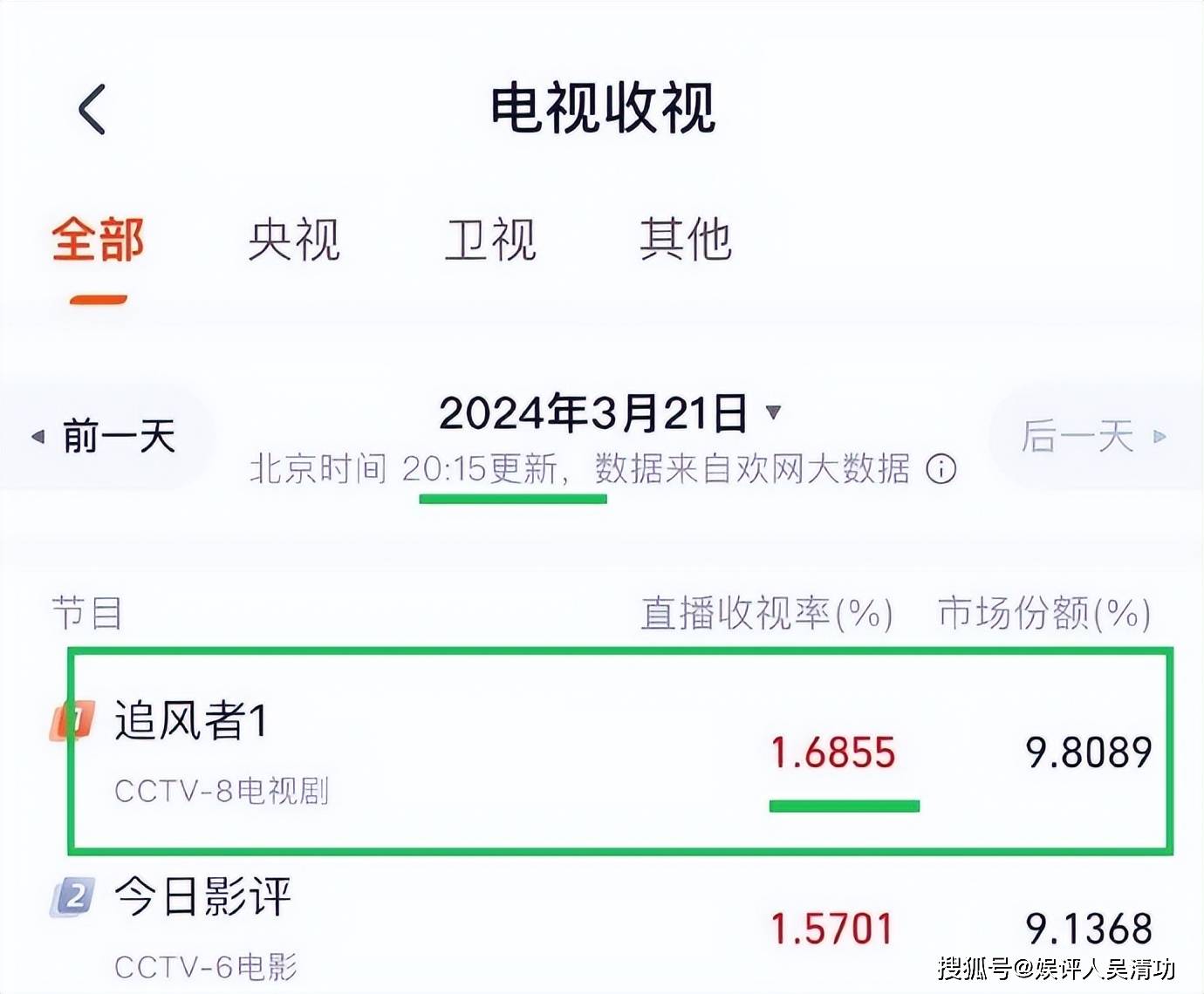 央视八套的收视率一般都比湖南卫视的收视率高,因为中老年观众喜欢看央视八套,而湖南卫视的观众相对年轻一些。非著名娱评人吴清功指出:所以赵丽颖的压力很大,但是腾讯视频和芒果TV加起来的影响力,比爱奇艺大多了。《与凤行》的网络热度有望比《追风者》高,赵丽颖的流量虽然比王一博低,但是仙侠剧对年轻观众的吸引力大。