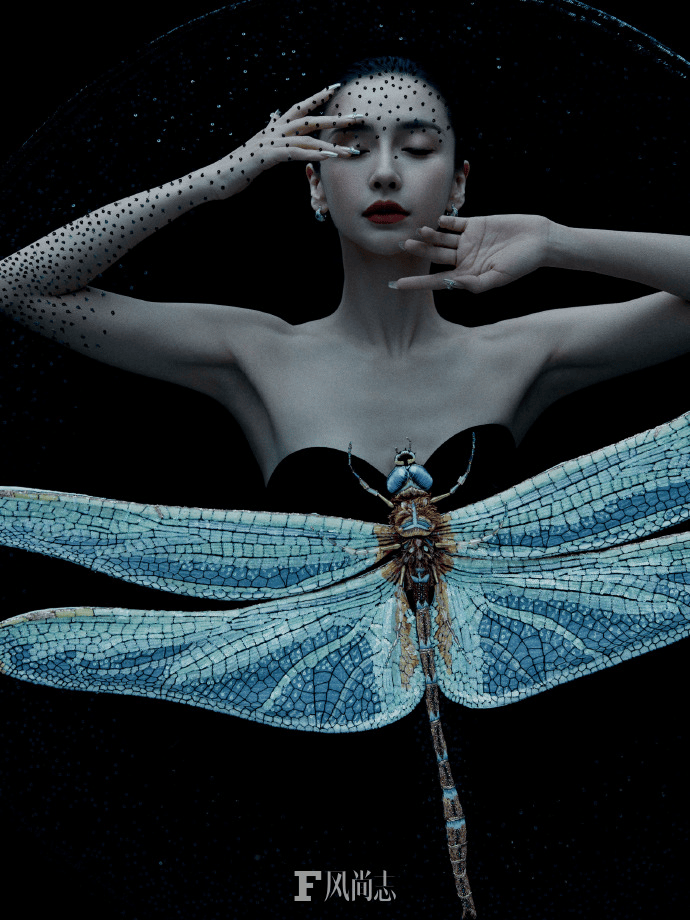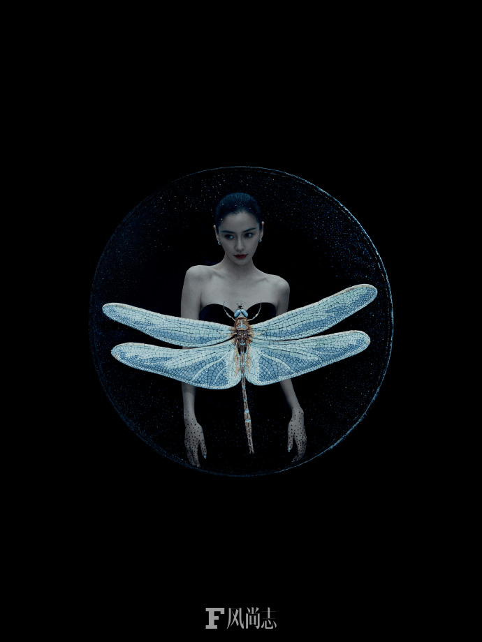 画面中的Angelababy也穿着黑色的抹胸礼服,秀出了自己那迷人的直角肩和修长的天鹅颈,深邃的锁骨和若隐若现的事业线也都显得特别的性感撩人了。而她的胸前也挂着一只特别形象生动的大蜻蜓,这也让她看上去显得更有活力了。