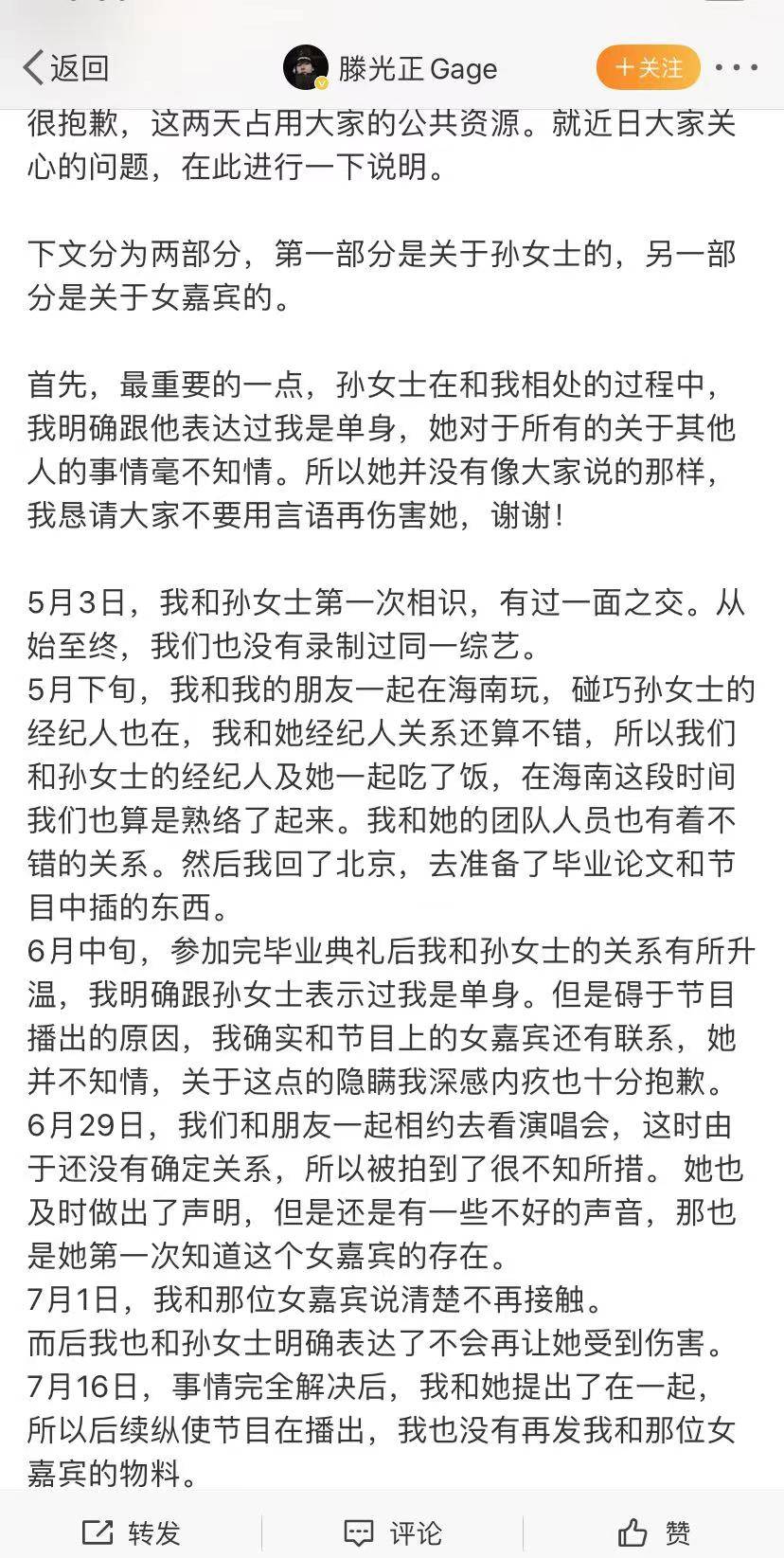 孙怡和女嘉宾沛沛都认为滕光正是渣男,脚踏几只船,但滕光正发文回应,详细描述和两位女性的交往关系。