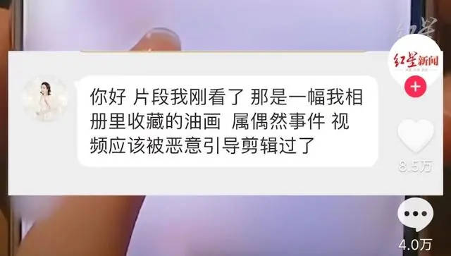 随后有网友将这段直播录屏发在了网上引发了一众网友热议,很多人也才第一次知道马卉这个名字,在事情发酵后,当事人马卉站出来解释称那并不是不雅照,而是自己收藏的一副油画,随后有记者询问马卉,是否有该油画的原图,对此马卉并未作出任何答复。