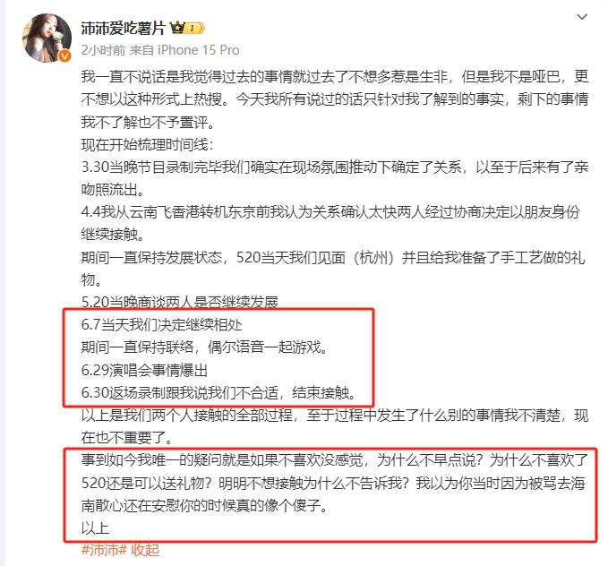 按照沛沛的爆料,她与滕光正确实在节目后有试着交往,截止节目收官前都还保持着联系,并且一起过了520。但是在他与孙怡一起看演唱的事情发生后,滕光正便在节目收官时紧急叫停了这段关系。说白了就是,滕光正确实一边与沛沛暧昧,一边与孙怡交往看演唱会。