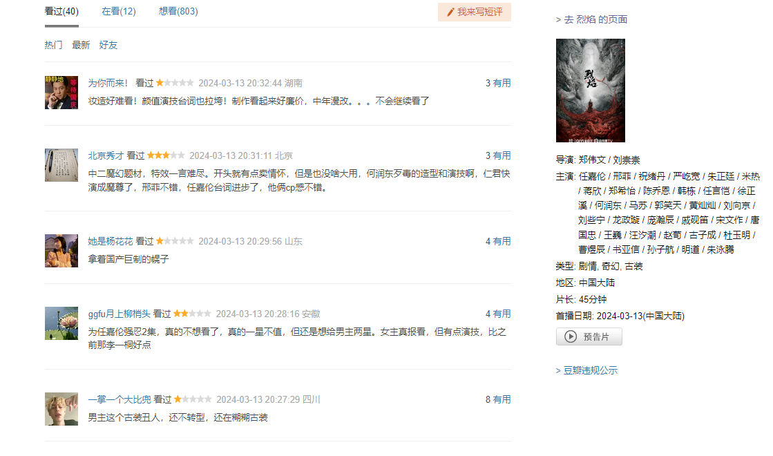 3月13日晚间,电视剧《烈焰》在爱奇艺6集上线,正式开启了首播模式。电视剧播出之后,在豆瓣形成了近乎清一色的差评。但平心而论,这部玄幻剧应该属于同类型剧当中质量较高的了,不应该给出这么多的差评才是。