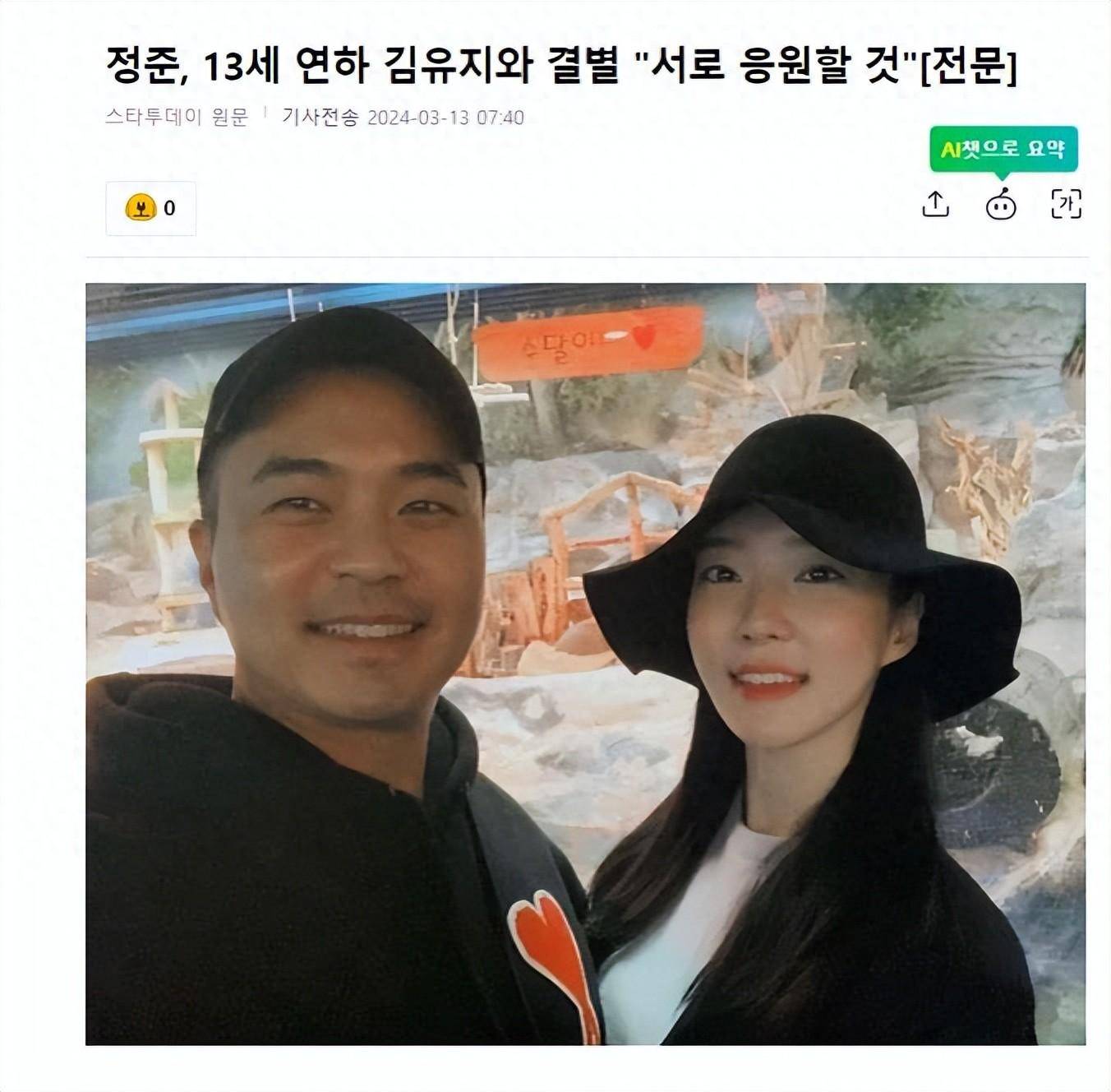 3月13日,有韩国媒体报道,韩国男演员郑俊,与通过韩国综艺节目《恋爱的滋味第三季》相识的,小13岁的女友金裕智分手了。演员郑俊承认与前恋人金裕智分手,距离分手传闻已经过去一年多了。