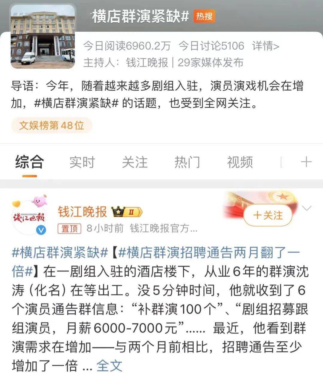 冷不伶仃,“横店群演紧缺”的喜讯上了微博热搜。相关报道称,“群演两个月工资翻了十倍”、“招聘通告至少增加了一倍”等等。点开底下评论,满是招募群演、化妆、造型各类剧组工种的信息。这番热闹景象,都快胜过大厂春招了,好一个金三银四。