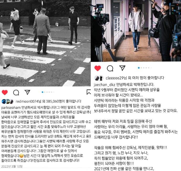 搜狐娱乐讯 3月11日,据韩媒报道,韩剧《语义错误》剧组在社交平台上更新重聚合照,时间正好在朴宰灿和朴栖含2021年3月10日发感谢帖的两年后。