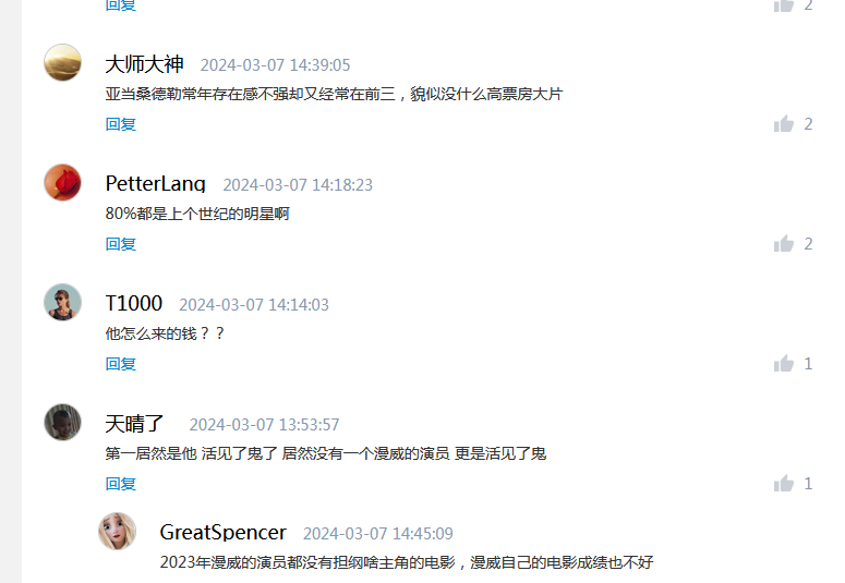 网友看到这个消息,纷纷发表意见!很多人都在质疑他怎么来的钱,有人纳闷前十名居然没有一个漫威的演员,更是活见鬼了。另一个网友指出,去年漫威的演员都没有担当主角的电影,漫威自己的电影成绩也不好!