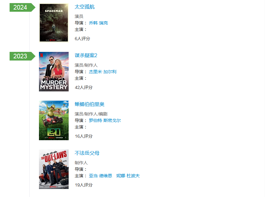 从资料上看,亚当·桑德勒在2023年带来了《谋杀疑案2》《不法岳父母》《蜥蜴伯伯里奥》三部作品,都是制作人,只有一部是男一号,加上他2024年初《太空孤航》,乍看存在感并不高。