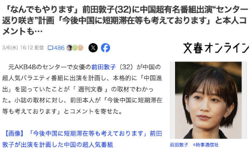 前田敦子回应不参加《浪姐》:“出演中国节目需要一定准备时间,因为还有日本的工作,时间对不上,无法完全投入比赛,所以与中国的经纪团队商量后决定放弃这次机会” 并表示自己以前就在学习中文,之后也考虑在中国短期停留。