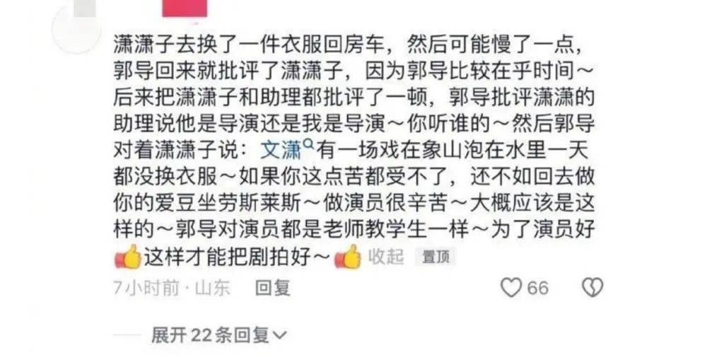 有人透露,程潇去换了一件衣服回房车,可能慢了一点,就被郭敬明导演给臭骂了,他助理也一起批评了。郭敬明对助理说:“他是导演,你听谁的?”他对程潇说:“文潇有一场戏在象山泡在水里一天,都没换衣服,如果你这点苦都受不了,还不如回去做你的爱豆坐劳斯莱斯,做演员很辛苦”