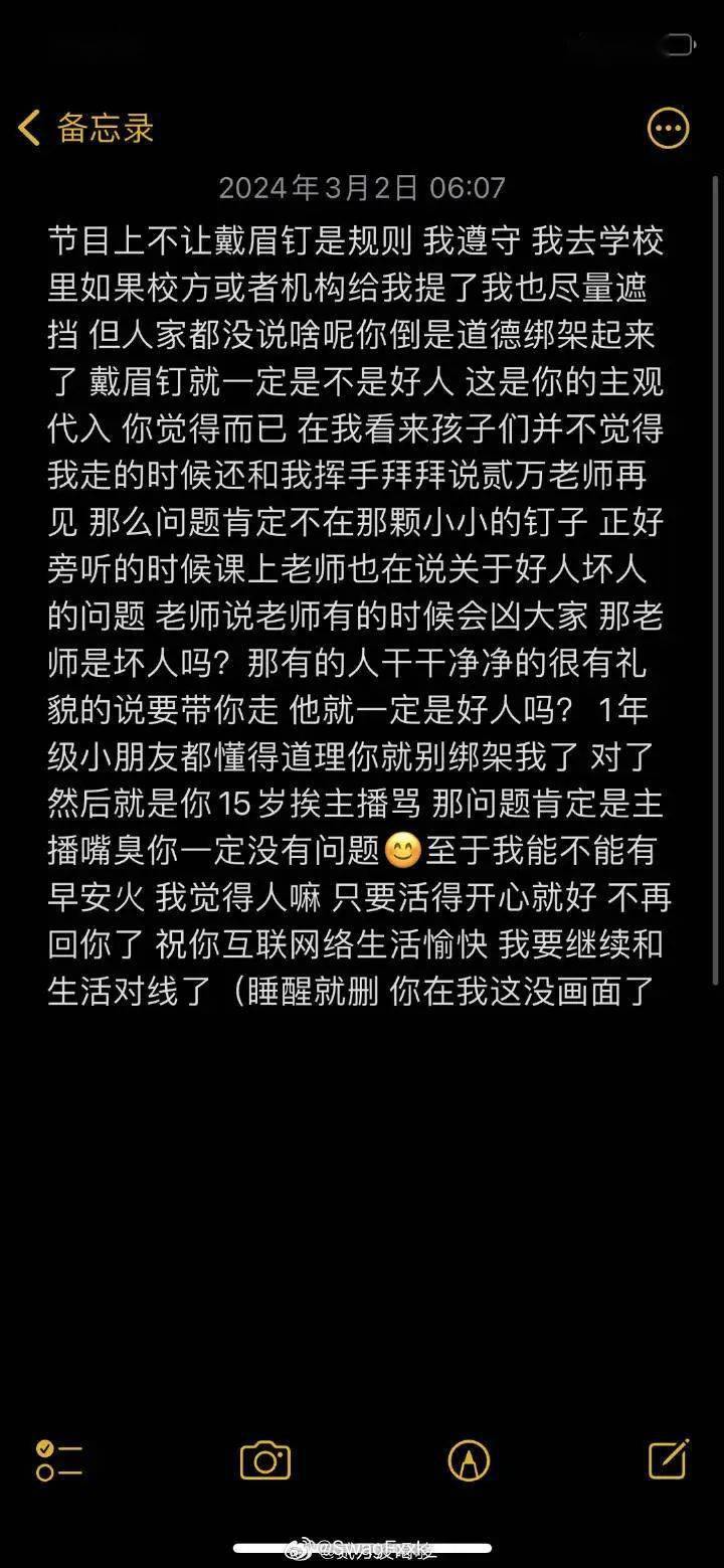 “节目不让戴眉钉是规则,我遵守,我去做公益如果学校或机构提了,我也会遮挡,但人家没说啥你还道德绑架上了。至于我能不能有早安火,我觉得人开心就好。”