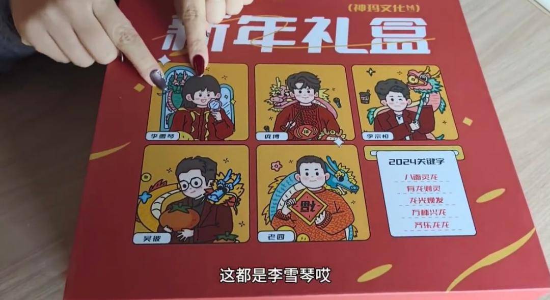 李雪琴工作室的新年礼盒封面上,画了5个人的Q版肖像,分别是李雪琴、庞博、李宗恒、吴彼和老四。
