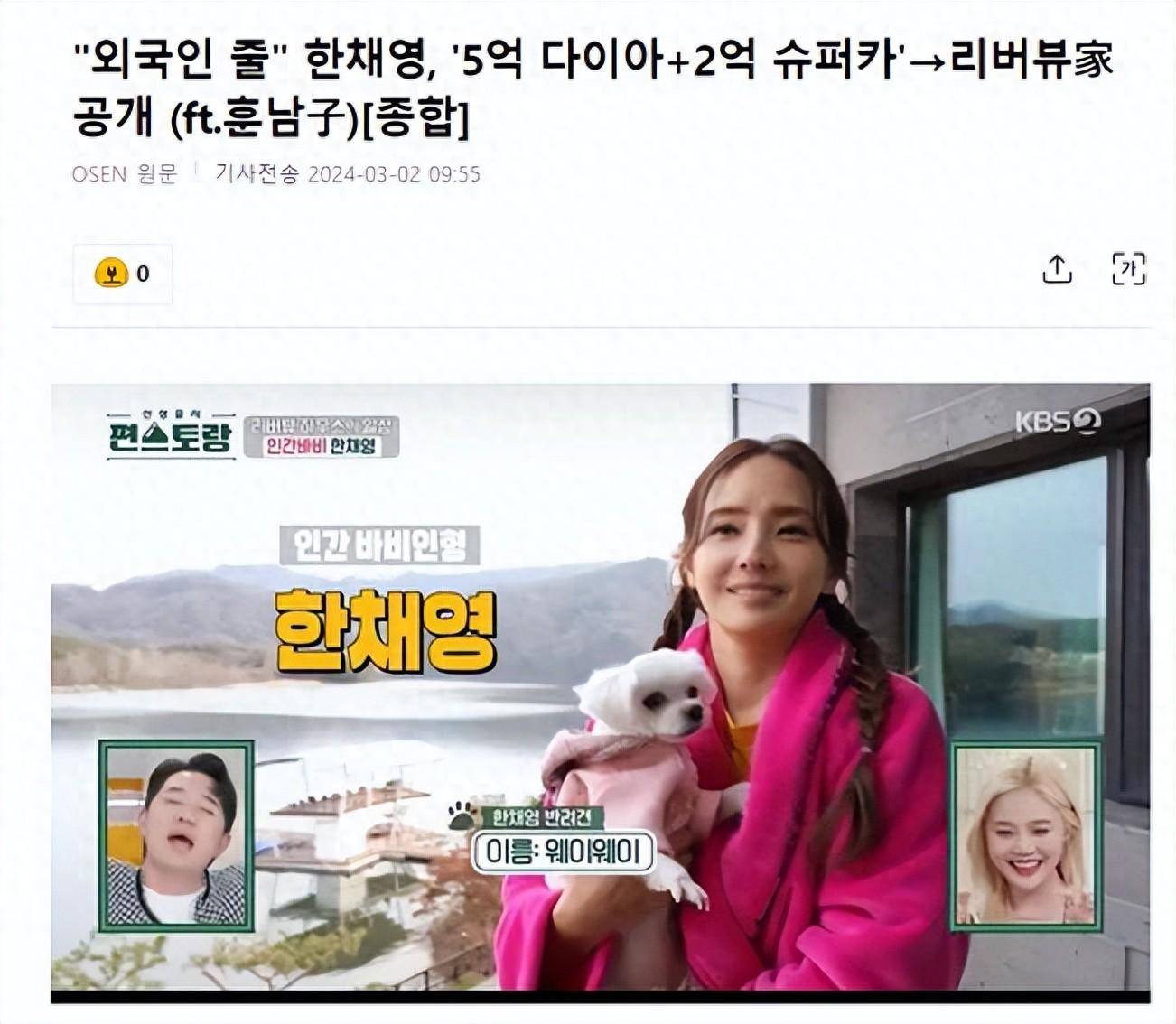 3月2日,有韩国媒体报道,演员韩彩英1日在综艺节目《Pyeon餐厅》中首次亮相,主持人Boom介绍了女演员韩彩英,称她为“大嘉宾”,韩彩英一出现,他就惊叹道:“她真的很漂亮”,对于听到20多年来没有改变的修饰语的感觉,韩彩英说:“年轻的时候没有感觉,但现在一听到就感觉好多了”,“我很高兴你仍然这么叫我”。