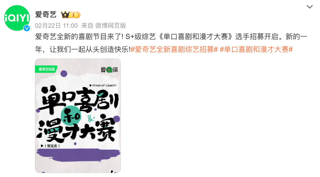 与《脱口秀和TA的朋友们》宣布选手招募先后动作的,是爱奇艺S 级综艺《单口喜剧和漫才大赛》选手招募开启,从节目名称和报名内容来看,爱奇艺的这档综艺更加聚焦,或许也能与《一年一度喜剧大赛》形成差异,以及喜剧形式的互补。