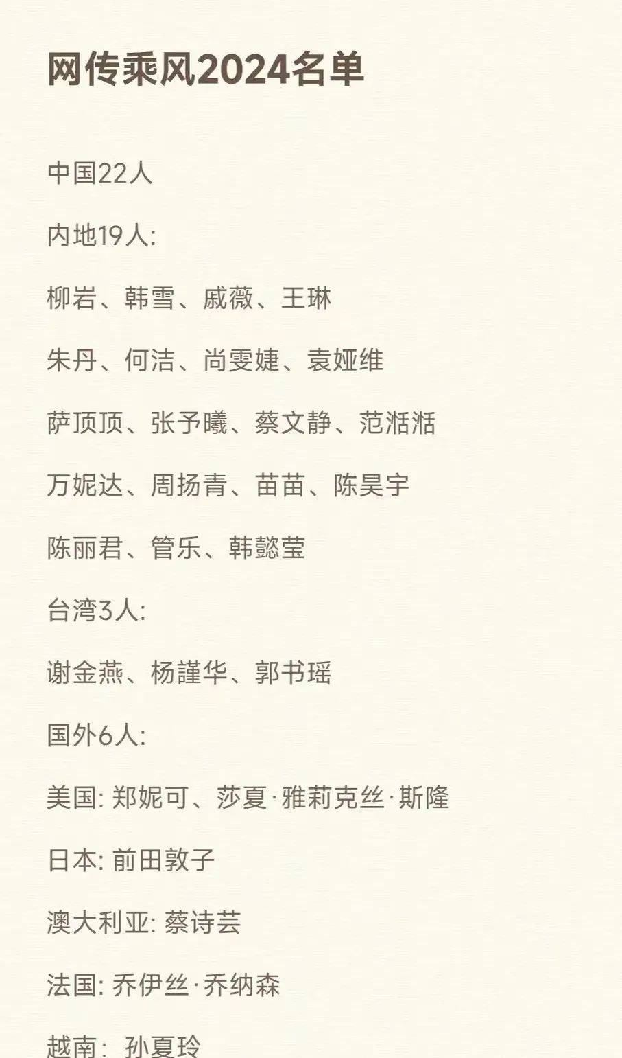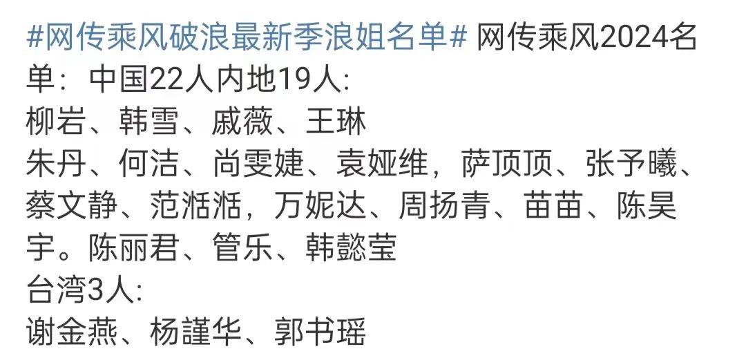 近日,网传《浪姐5》最新名单曝光,内地19人,台湾3人,国外6人,引起了一阵热议。
