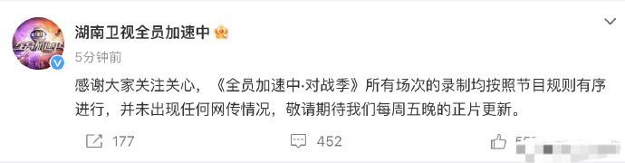 原标题:《全员加速中》发文回应:节目正常录制,并未出现网传情况