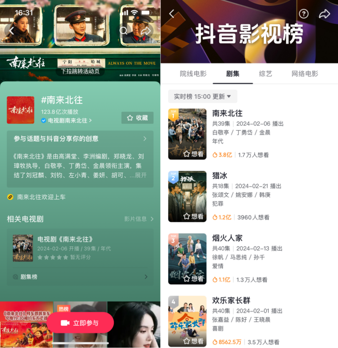 这个数据量级,已然可以与爱奇艺去年年末热播的《宁安如梦》和《一念关山》相媲美。那么,这次《南来北往》在抖音宣发上又做对了哪些“功课”才得以被更多网友看见?