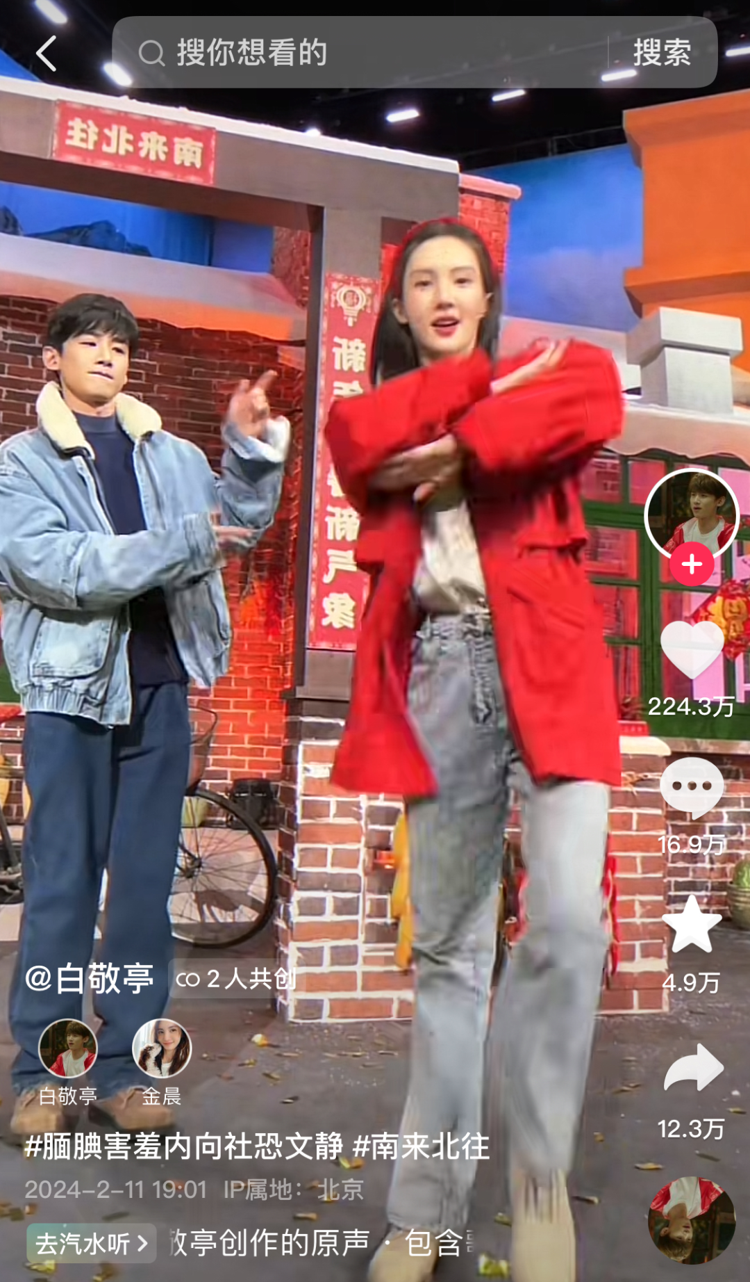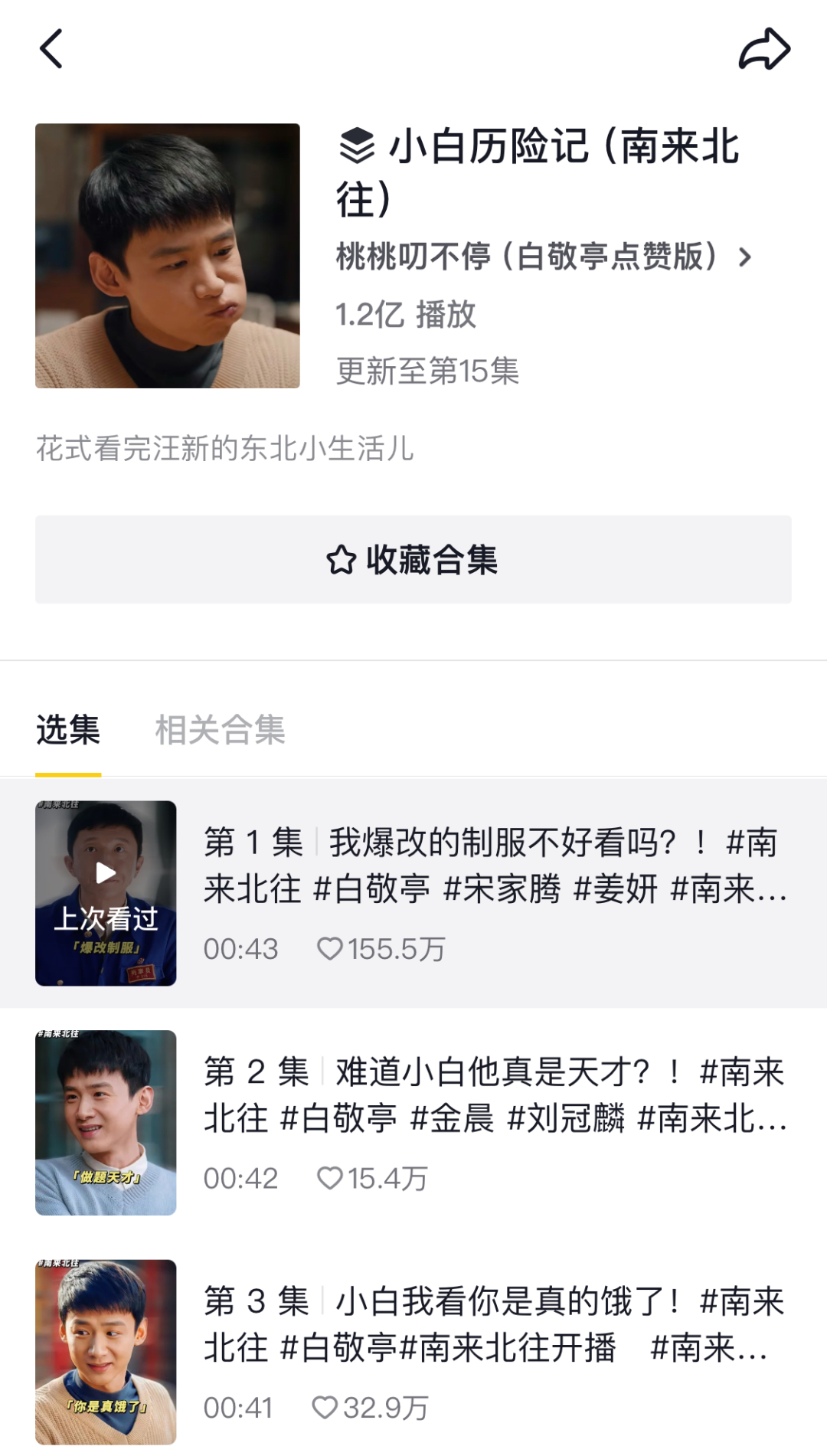 其中,账号@桃桃叨不停(白敬亭点赞版)为该剧单独设立合集“小白历险记(南来北往)”,充分发挥白敬亭的明星效应为剧集引流。截至2月23日,该合集累计播放量达1.2亿,单条视频最高点赞量达155万 。