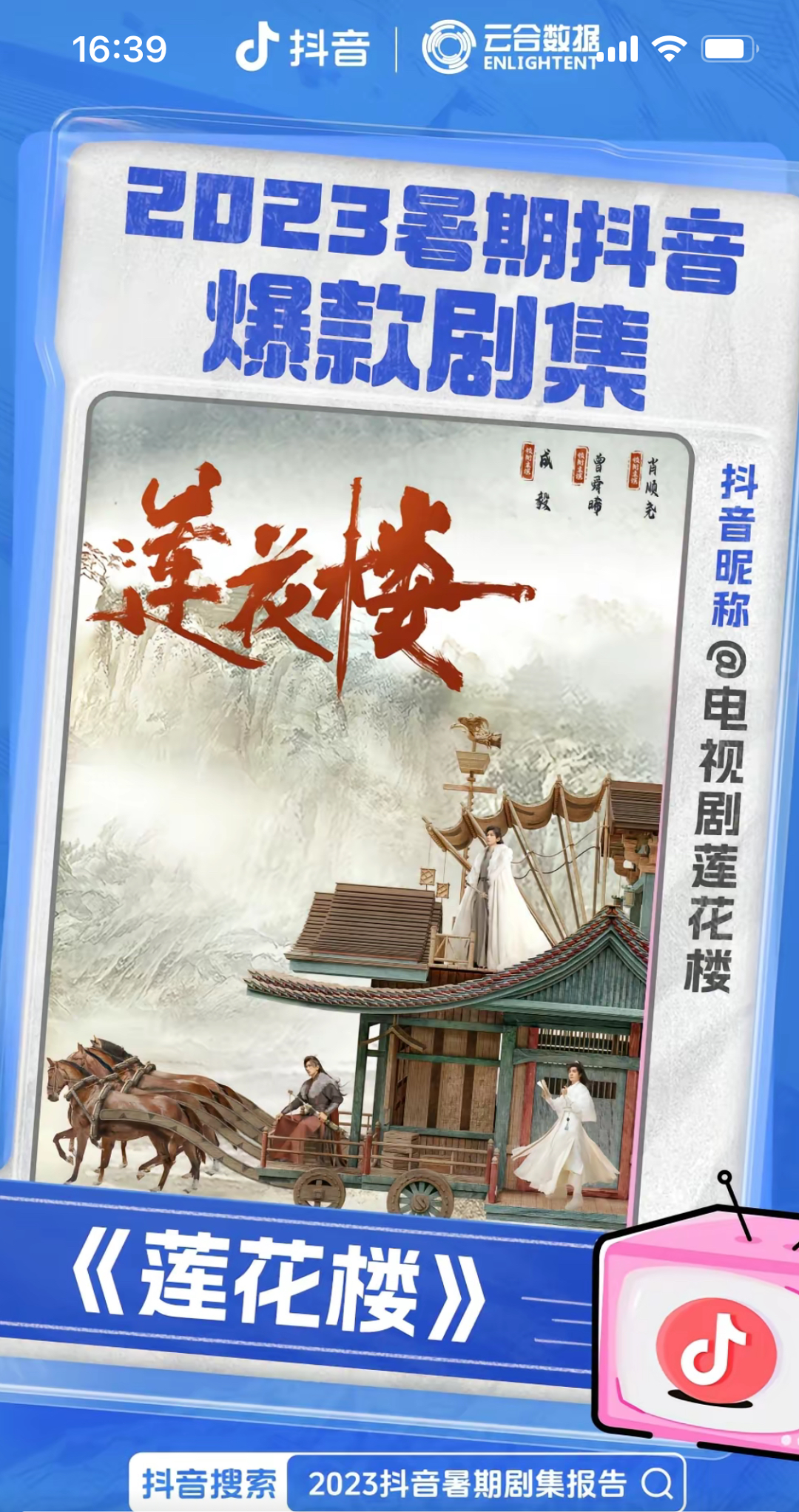 在抖音剧宣实操层面,爱奇艺通过多部剧集积累了丰富经验,无论是账号的长期运营还是热点内容的破圈,皆有出圈案例可供借鉴。以去年暑期在爱奇艺热播的古装武侠剧《莲花楼》为例,通过抖音官号的拟人化经营打造剧集核心讨论阵地,2023年累计收获了182万粉丝,作品获赞量达1亿 ,多支爆款短视频下出现剧粉暖心长评,也被官方认证为“2023暑期抖音爆款剧集”。