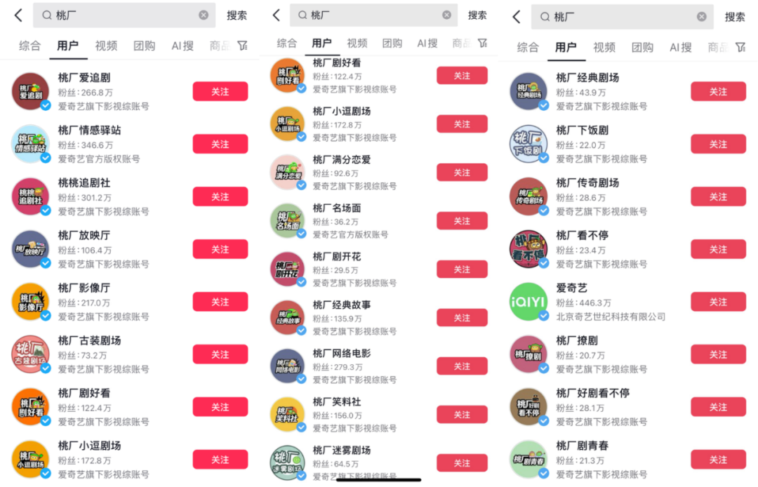 与此同时,爱奇艺的MCN账号矩阵也助推了《南来北往》在抖音上的热度发酵。在抖音上搜索“南来北往”,相关高赞短视频的发布账号除了其官抖,还会出现爱奇艺及其旗下多个影视综账号,包括@桃桃叨不停(白敬亭点赞版)、@桃厂爱追剧、@桃厂剧好看、@桃厂名场面等,所属MCN机构皆是“猕猴桃MCN”。