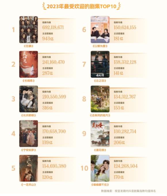 这一点从近两年的“抖音剧集年度报告”中可看出端倪,例如在上月底抖音和云合数据联合发布的《2023抖音剧集年度报告》中,爱奇艺热播剧在抖音评出的2023年最受欢迎剧集TOP10里独占五席。其中,年度爆款剧《狂飙》以943亿的主话题播放量断层领先,大热古装剧《宁安如梦》《一念关山》也均名列前五。