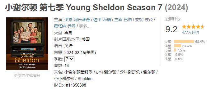 豆瓣上,《小谢尔顿》从第一季到第七季,评分从未落在9分下,本月新回归的第七季更是拿到了9.2的分数。