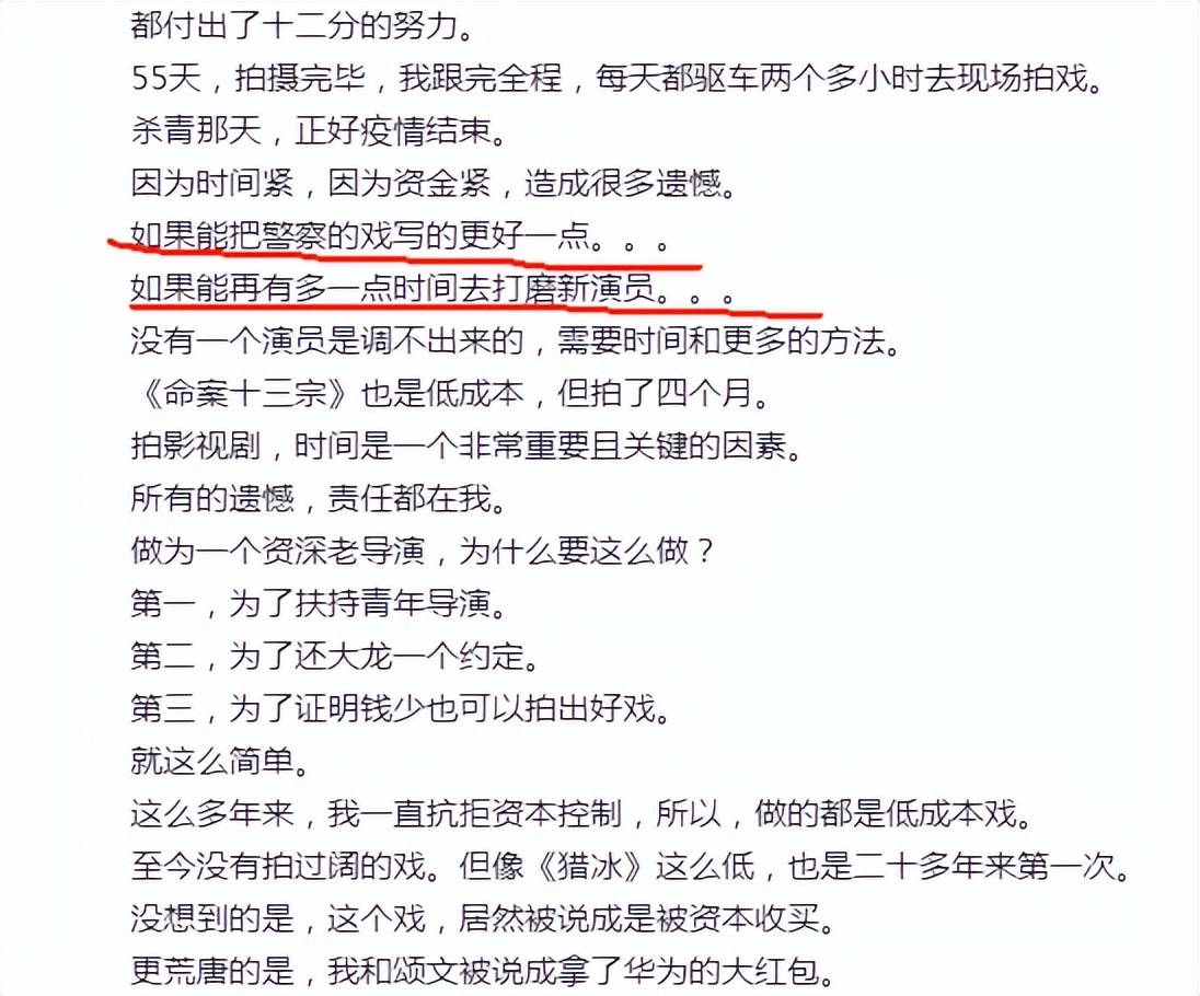他在文中坦言“因为资金紧,造成很多遗憾。如果能把警察的戏写的更好一点,如果能再有多一点时间去打磨新演员。”