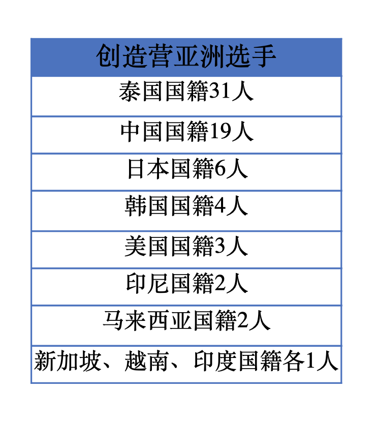 该节目历时半年,从几千人中选出了来自10个国家共70位少女同台竞演。其中最多的是中泰学员,占比达到50%,19位来自中国,31位来自泰国,全球其他地区共占比50%。