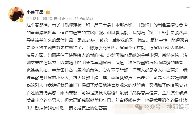 他表示:“这个春节档,看了《热辣滚烫》和《第二十条》两部电影,《热辣》的出色宣传与贾玲的卖命减肥打拳,值得有这样的票房回报。但以戏论戏,我认为《第二十条》是张艺谋导演这几年来的最佳作品,是2024继《繁花》后给我的又一惊喜。”,他怒赞《第二十条》题材尖锐,五条线脉络分明,演员各个有戏,导演功力令人佩服。