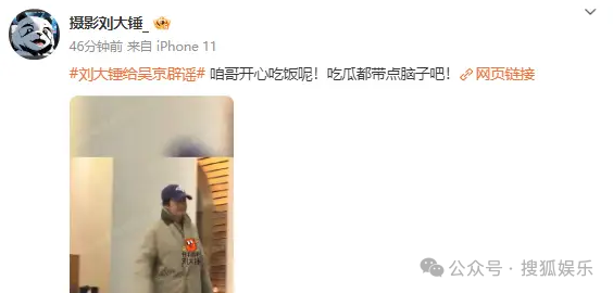 2月22日,刘大锤帮吴京辟谣生病传闻,称最近还看到吴京与好友一起聚餐,“咱哥开心吃饭呢,吃瓜都带点脑子吧!”