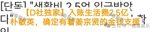 可是上个月,D社独家爆料朴敏英接受过前男友姜钟贤提供的生活费2亿5000万的支援,还自称掌握了姜相关公司汇款给朴敏英个人名义账户的事实。