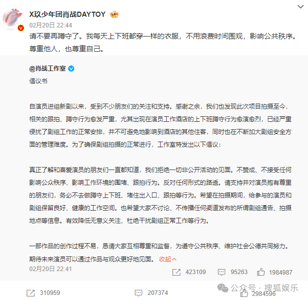 据悉,早前肖战及工作室曾发表倡议书,表示不赞成、不接受任何影响公众秩序、影响工作环境的围堵、跟拍行为。