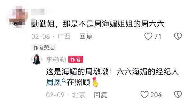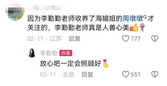 李勤勤在评论区回复网友表示,她收养了周海媚的爱犬周墩墩,而周六六则被周海媚生前经纪人周凤照顾着。面对网友关心周墩墩的生活,李勤勤回应说,“放心吧,一定会帮海媚照顾好的。”