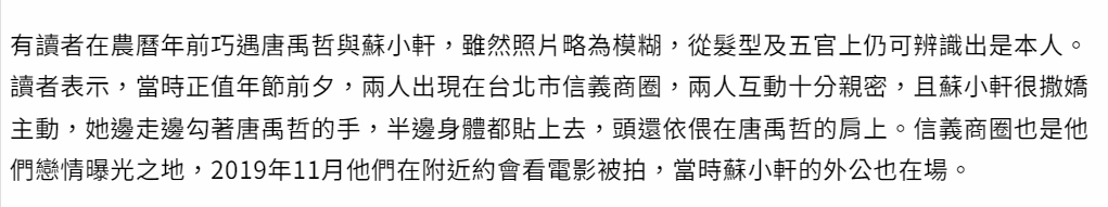2月20日,台媒报道,有网友在台北市信义区巧遇唐禹哲与苏小轩,两人互动甜蜜,唐禹哲的豪门驸马之位相当稳固。
