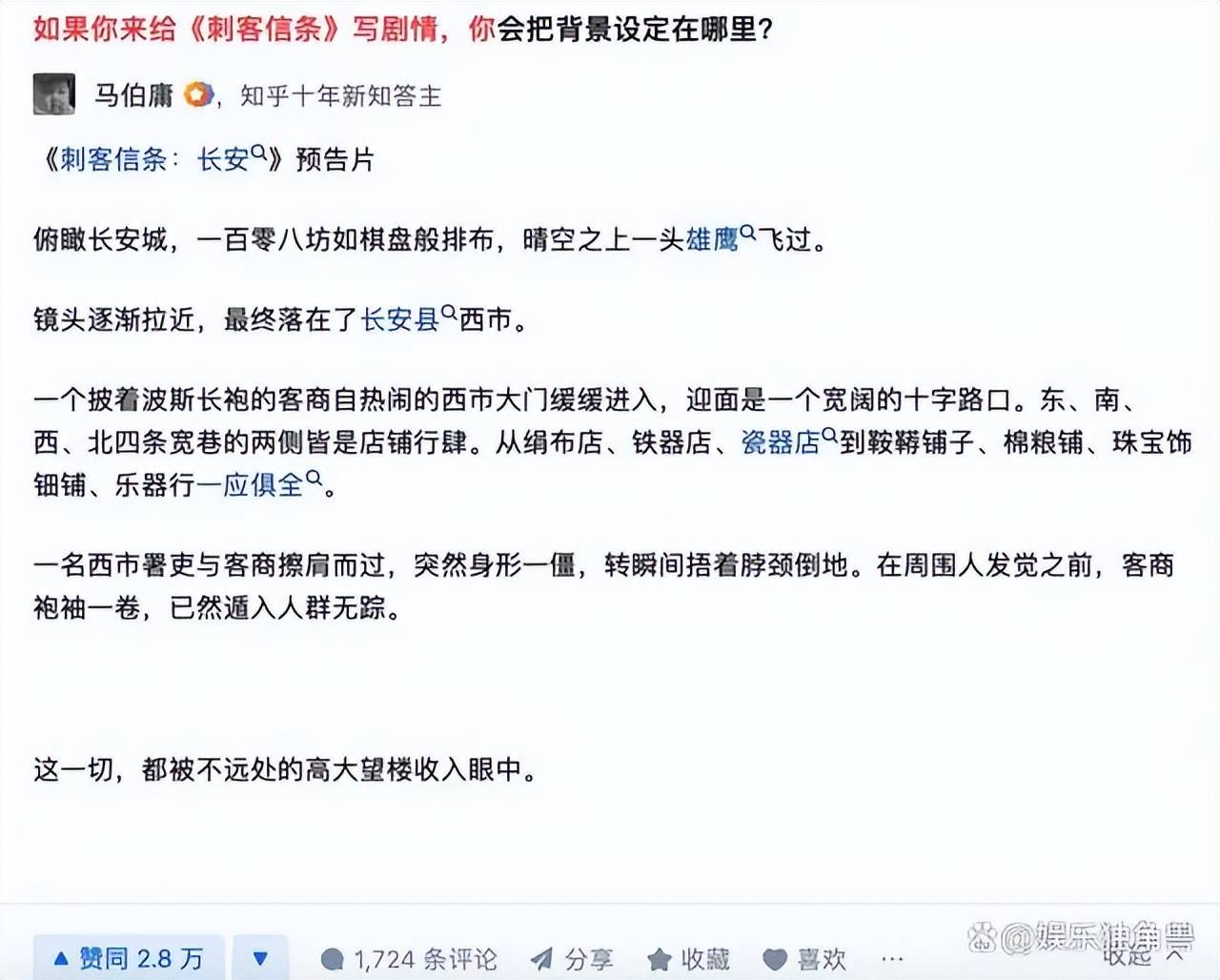 2019年,知乎用户梦娃在问题“为什么后宫中嫔妃们一定要争宠”中用故事化的方式予以回答,最终连载的回答成了火遍全网的网文《宫墙柳》;同一年,七月荔在问题“如果你是虐文里的女主你会怎么办”下创作了《洗铅华:恶毒女配生存录》;而马伯庸则根据“如果你来给《刺客信条》些剧情,你会把背景设计在哪里?”的提问写出了《刺客信条:长安》,被曹盾导演改编为《长安十二时辰》,进而大火。