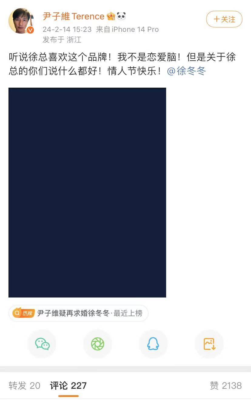 尹子维晒出钻戒,疑再度求婚徐冬冬,两人曾经分手,后再度复合,可能会以恋爱为目的,最终走到一起,他们还一起录制综艺节目,也是合体秀恩爱。