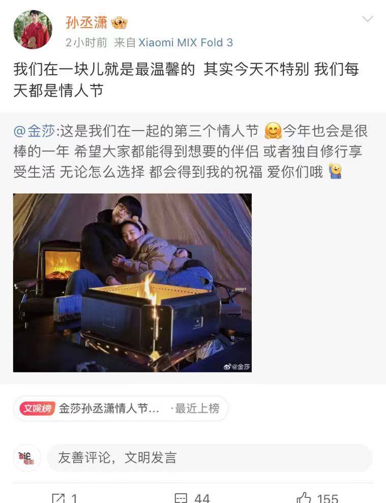 金莎说这是他们在一起的第三个情人节,孙丞潇也转发了金莎的发文,表示两人在一起就是最温馨的,每一天都是情人节。这狗粮也是撒得有点意思。