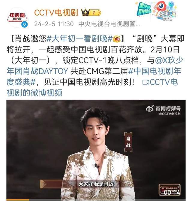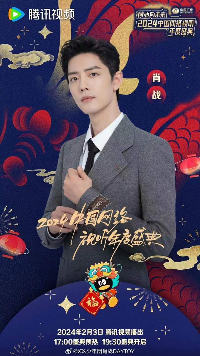 2024年2月5日,CCTV电视剧官方微博发布消息,肖战邀您大年初一看剧晚,2月10日(大年初一),CCTV-1晚八点档,CMG第二届中国电视剧年度盛典即将启幕。