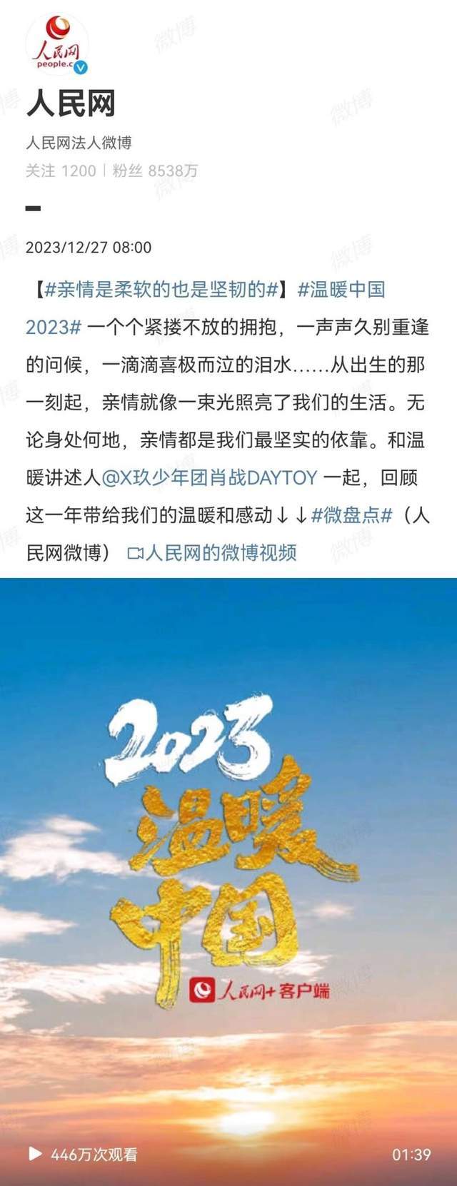 温暖的故事还在继续,2023年12月27日,肖战成为《人民网》坚定选择的“温暖讲述人”,为相关视频配音,回顾2023年温暖和感动瞬间,探讨中国人“家”和“亲情”的内涵,向更多的人传播正能量。肖战登上人民网这个国家级的媒体,这是对他个人成就的一种认可,更是彰显了他在社会责任和公益事业上的作用。