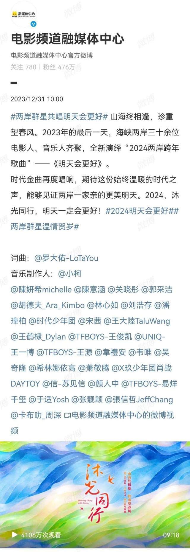 2023年12月31日,肖战同海峡两岸三十余位电影人、音乐人一起,全新演绎电影频道制作的“2024两岸跨年歌曲”——《明天会更好》,唱响这份始终温暖的时代之声,见证两岸一家亲的更美明天。肖战用自己的声音传递这份情感,让两岸人民感受到了希望和力量。