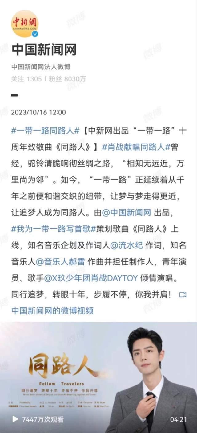 2023年10月16日,肖战演唱致敬曲《同路人》,这首歌由知名音乐企划及作词人流水纪作词,知名音乐人郝雷作曲并担任制作。肖战悦耳动听的声音治愈又温暖,温润又不失大气,跟这首歌适配度极高,让听众直呼“有种国泰民安的感觉”。用歌声传递爱与希望,《同路人》MV在中国新闻网官网、微博、抖音等多个平台以及中新经纬、中新文娱、中国新闻社等官方微博发布,海内外全网播放量已超9000万,相关报道总互动数超千万,反响热烈。