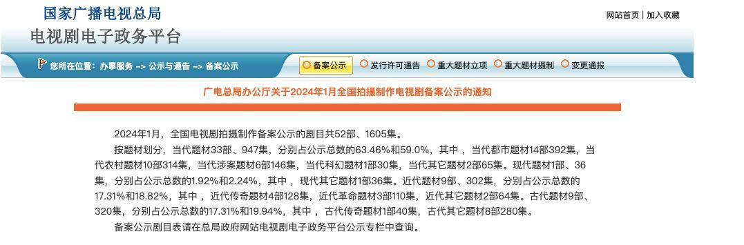日前,广电总局发布《关于2024年1月全国拍摄制作电视剧备案公示的通知》。